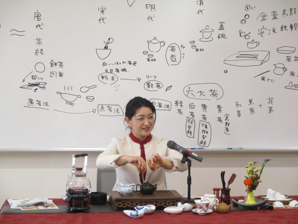 | 講師の小林歩美さん | アシスタントの池田さんと吉住さん | 中国茶の歴史について講義中 |