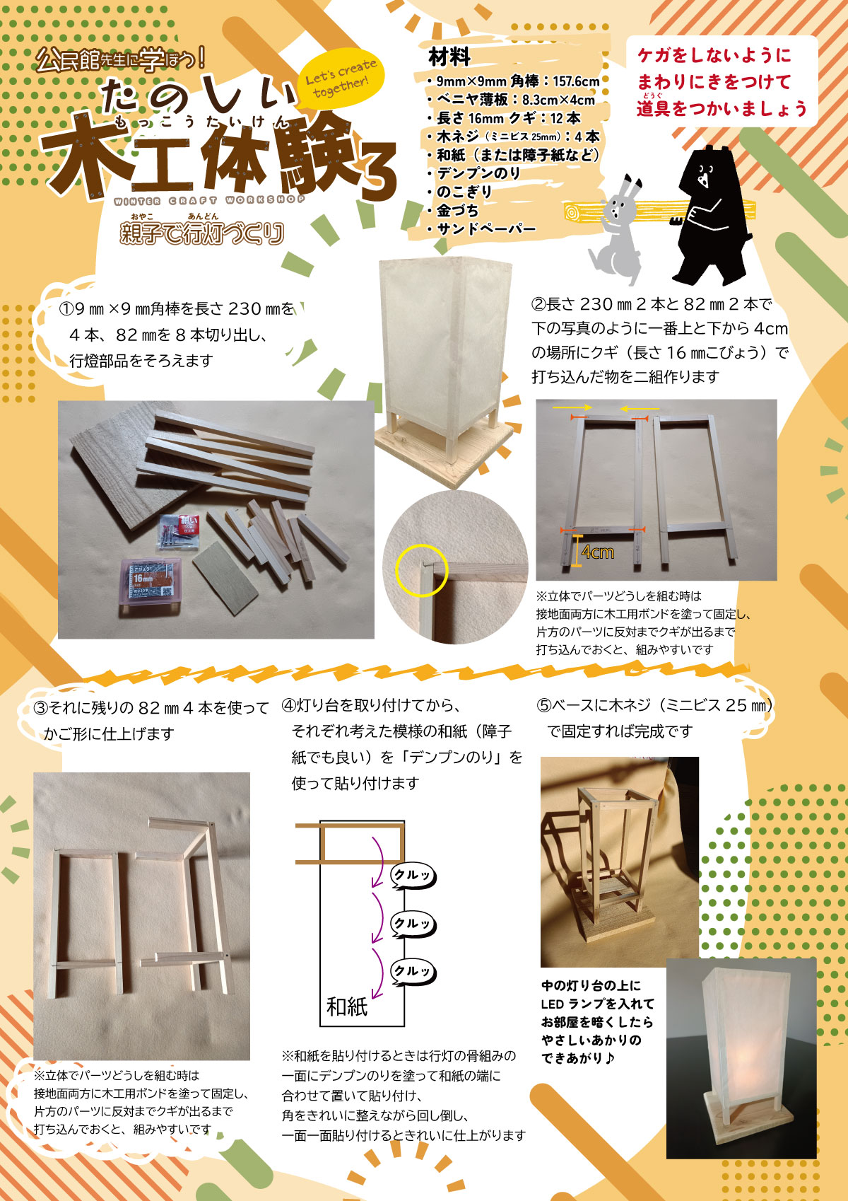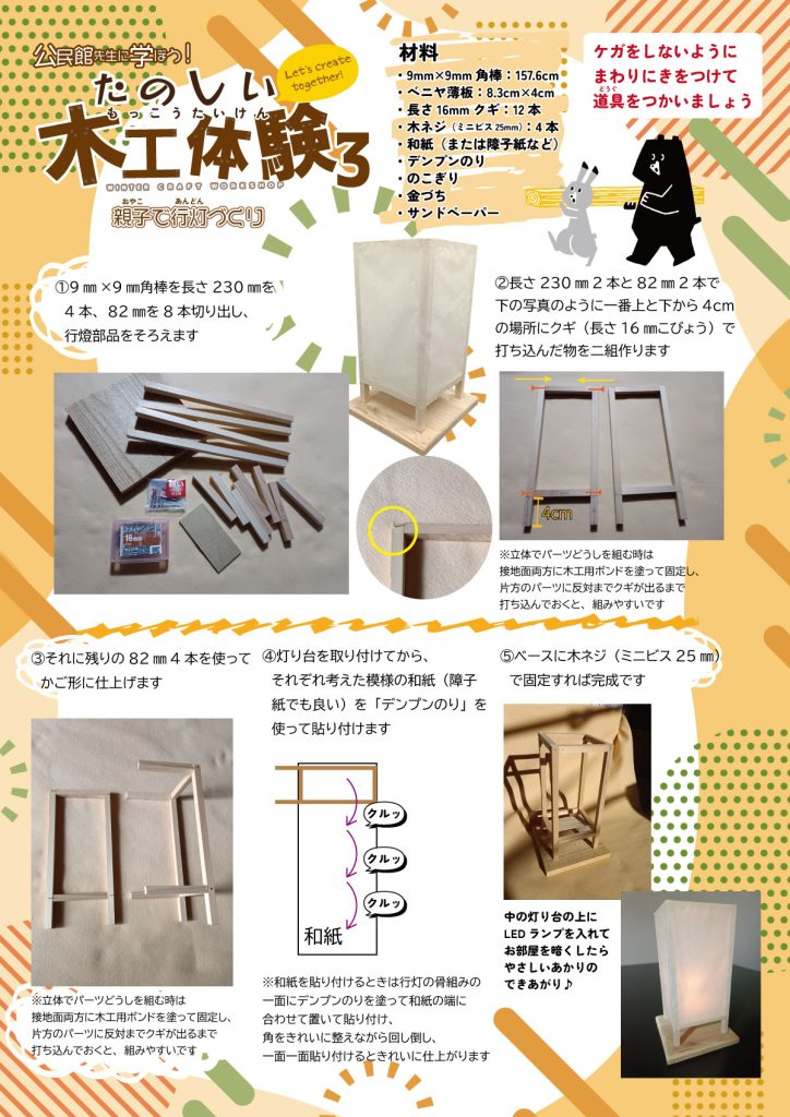 2月7日(土)中央公民館の造形室にて「公民館先生に学ぼう!たのしい木工体験3」を開催しました!木工体験の3回目となる今回は『親子で行灯づくり」。今回もたくさんの方にご応募いただき、抽選となりました。講師は宝塚市サイエンスサポーターの池田稔治先生。