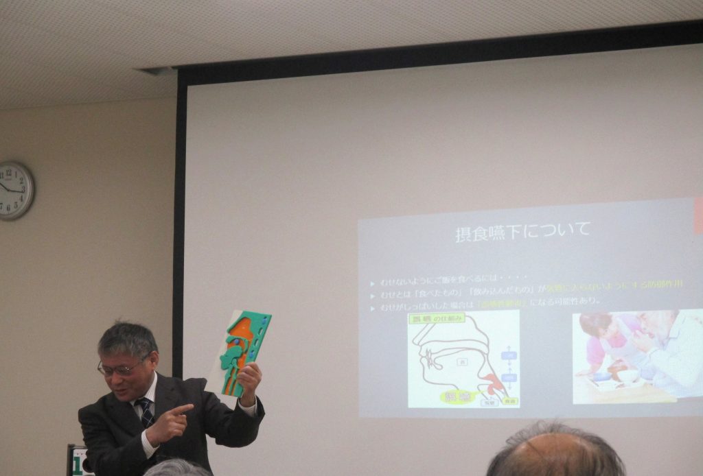 1時間の中で仕組みや口(舌)や上半身の軽い食前の運動などなど教えていただきました。中でも大切なのは「ゆっくり、よく噛んで食べる」とのことです。日頃から意識して誤嚥性肺炎にならないように、むせないで食べることを維持できるようにしたいと思います。
