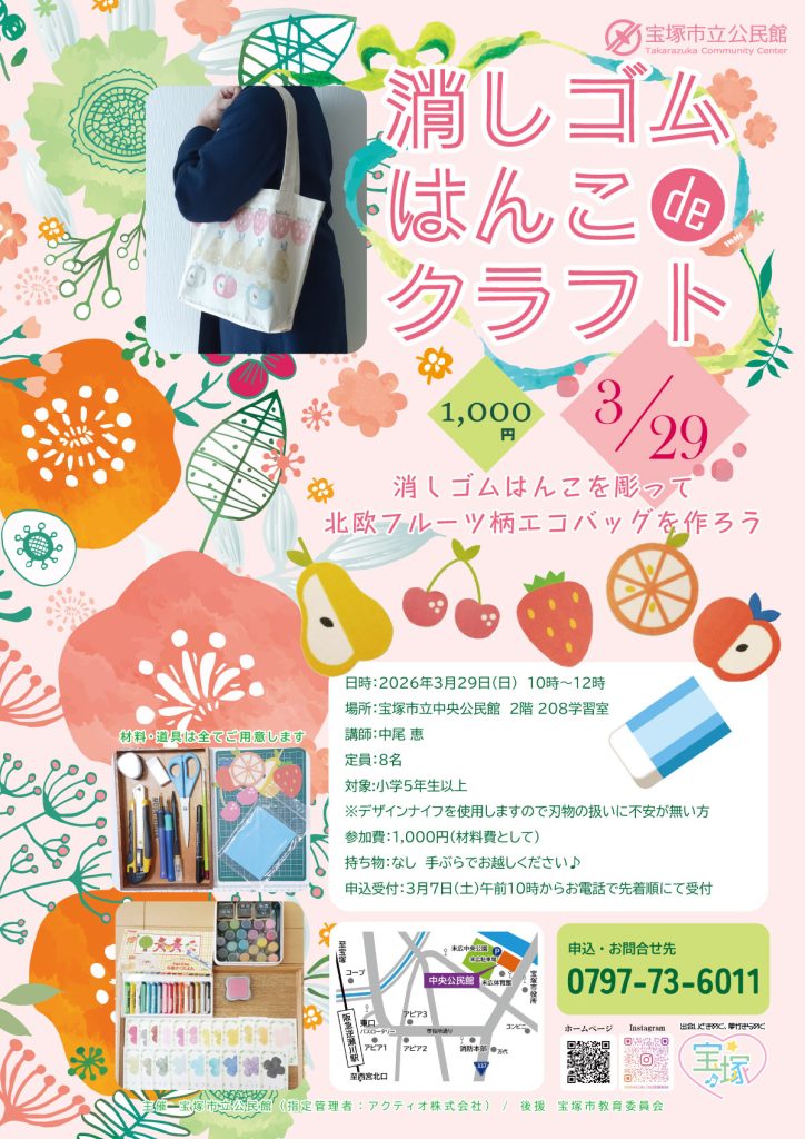 日時:2026年3月29日(日)10時~12時 場所:宝塚市立中央公民館 講師:中尾 恵 定員:8名 参加費:1,000円(材料費として) 持ち物:なし 材料、道具は全て揃えていますので手ぶらでお越しください♪ 申込受付:3月7日(土) 午前10時から お電話で先着順にて受付 電話 0797-73-6011