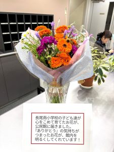 このたび、地域の長尾南小学校の児童のみなさんから、学校で大切に育てたお花をいただきました。