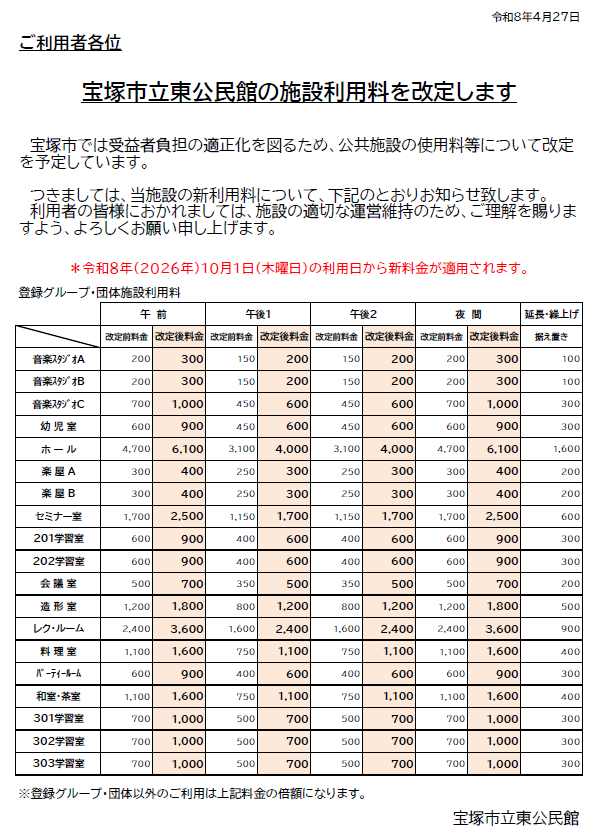 宝塚市立東公民館 新料金表