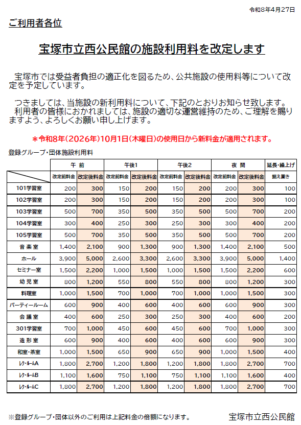 宝塚市立西公民館 新料金表