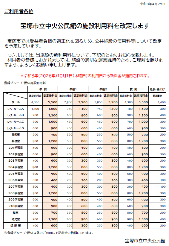 宝塚市立中央公民館 新料金表
