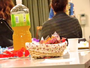 思い思いのしぐさでリズムに身を委ねるみなさん。お茶とお菓子も一緒でリラックス♪