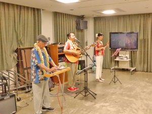 演奏が始まるとセミナー室が一気にハワイアンモードに変わります。