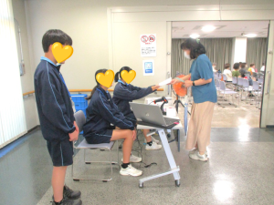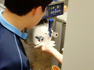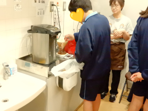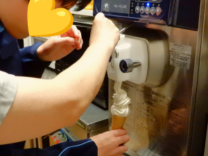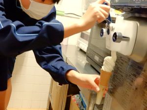 トライやるウィークの〆は、おそらく西公民館での就労体験の目玉であろうソフトサーバーでソフトクリーム巻き!最近はセルフでソフトクリームを作れるお店が増えたせいか3人とも上手に巻けてましたよ😊