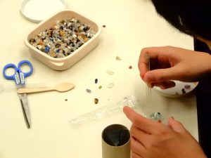 最終日は「自主事業を考えよう!」ということで、当館・サワダさんが講師を務める「天然石で万華鏡を作ろう!」講座をお試し体験。