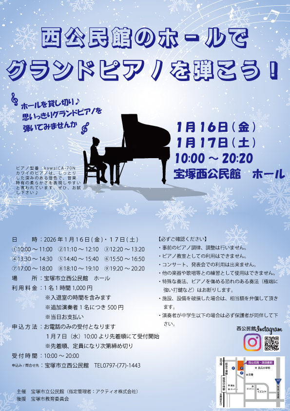 【1/7~申込開始】西公民館のホールでグランドピアノを弾こう!