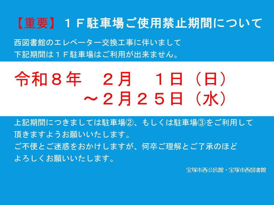 西図書館のエレベーター工事に伴いまして、下記期間は1階駐車場のご利用ができません。