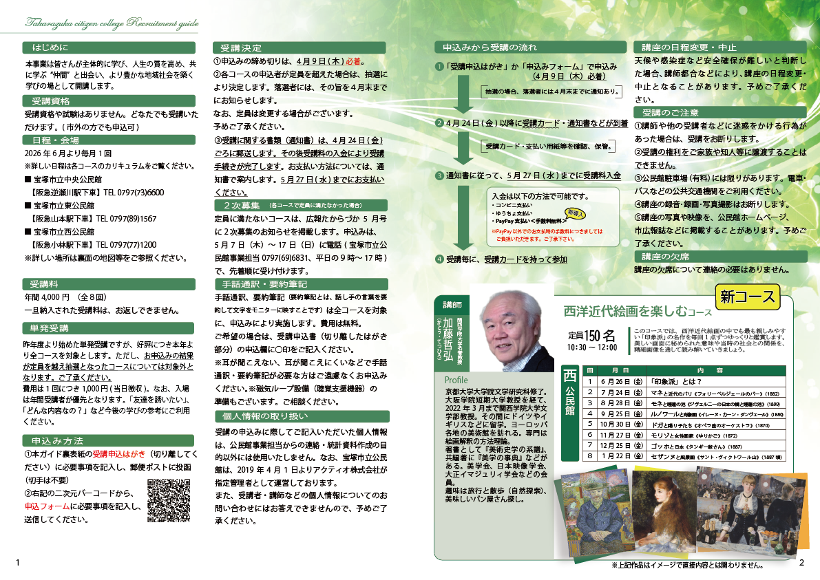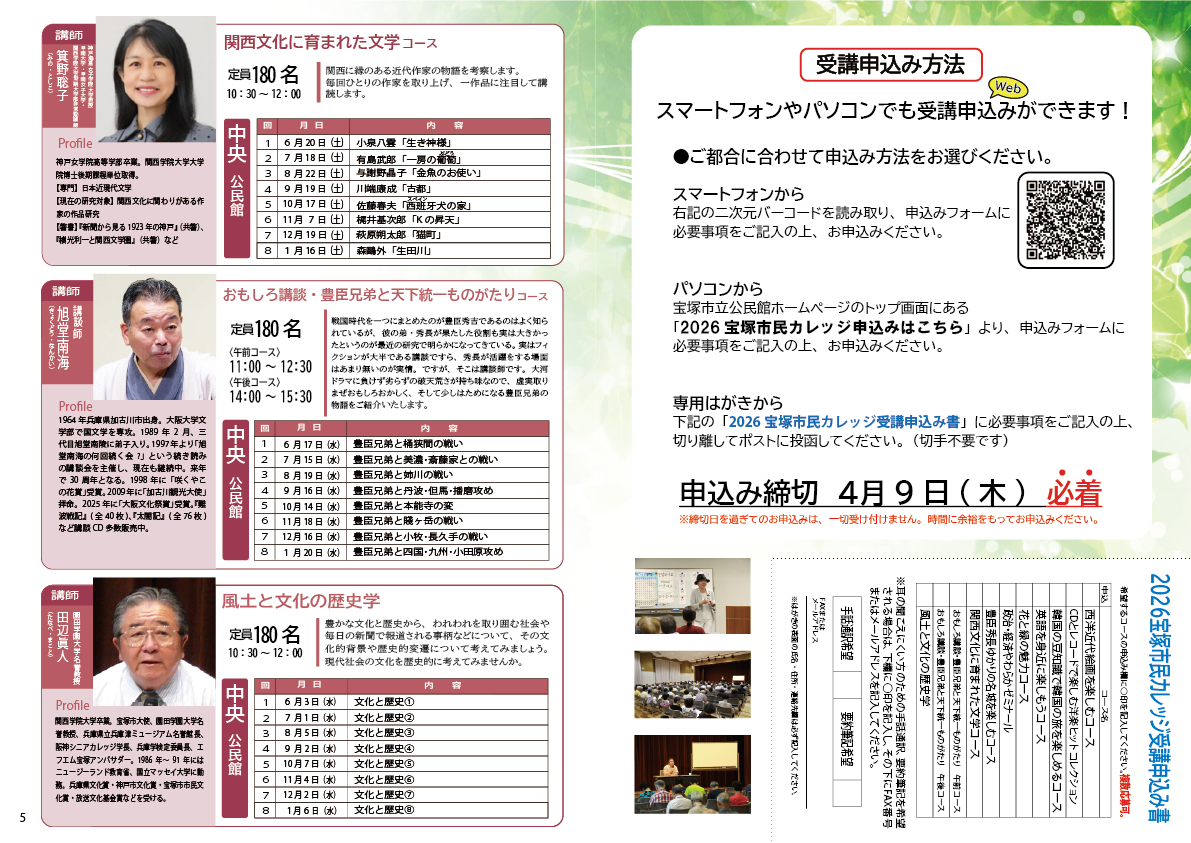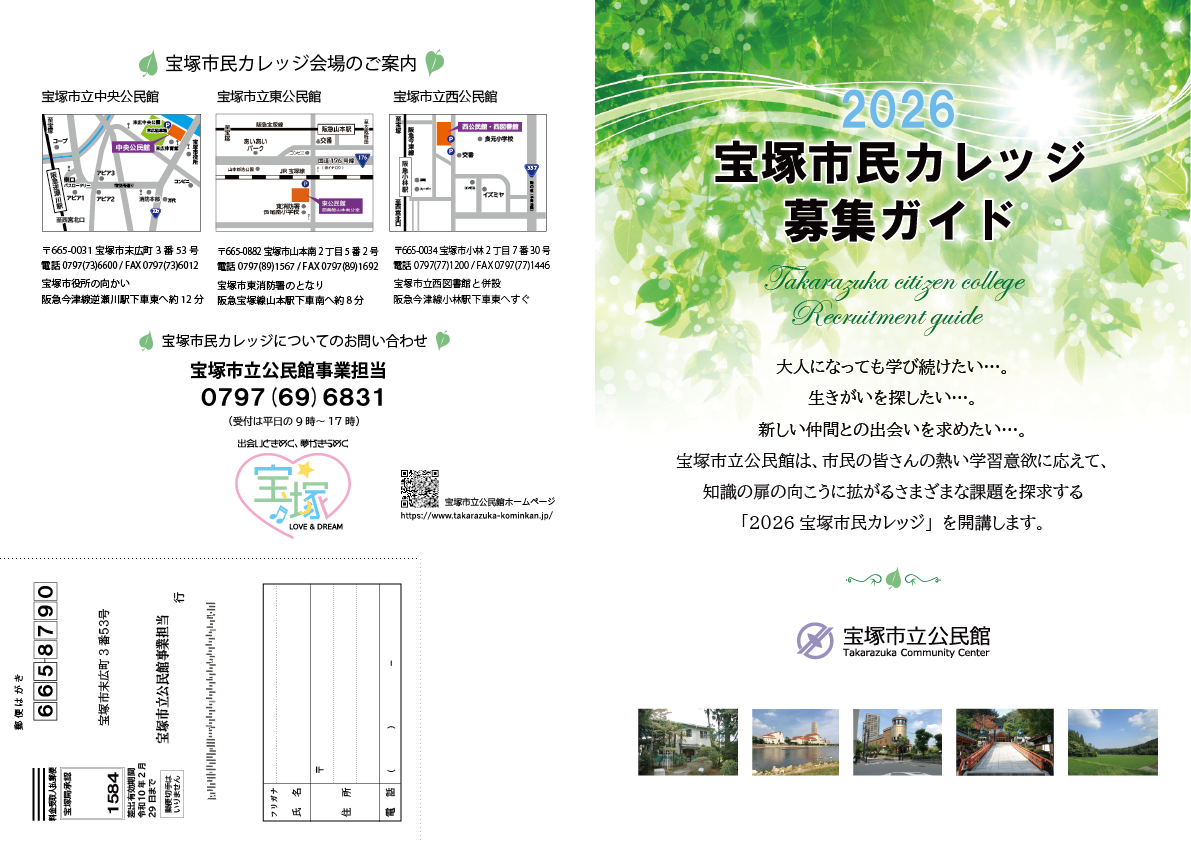●申込み方法 ①本ガイド裏表紙の受講申込はがき(切り離してください)に必要事項を記入し、 郵便ポストに投函(切手は不要) ②下記URLから、申込フォームに必要事項を記入し、送信してください。 https://www.takarazuka-kominkan.jp/takarazuka_citizencollege/college_form/