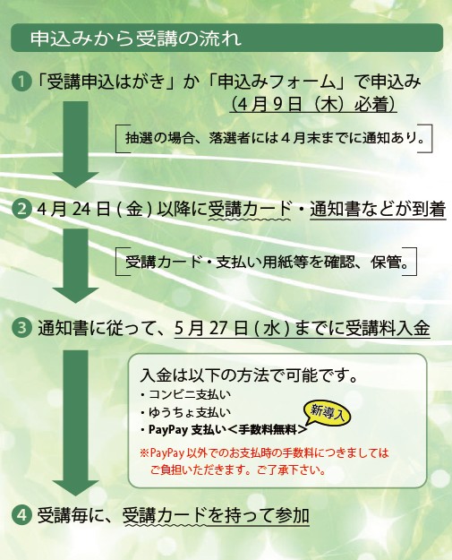 ●受講決定 ①申込みの締め切りは、4月9日(木)必着。 ②各コースの申込者が定員を超えた場合は、抽選により決定します。 落選者には、その旨を4月末までにお知らせします。 なお、定員は変更になる場合がございます。予めご了承ください。 ③受講に関する書類(通知書)は、4月24日(金)ごろに郵送します。 その後受講料の入金により受講手続きが完了します。 お支払い方法については、通知書で案内します。 5月27日(水)までにお支払いください。