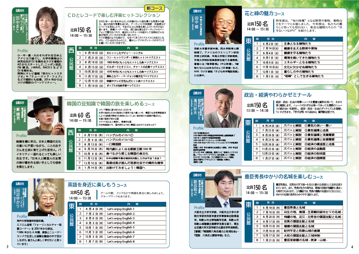 昨年度より始めた単発受講ですが、好評につき本年より全コースを対象とします。 ただし、お申込みの結果が定員を越え抽選となったコースについては対象外となります。ご了承ください。 費用は1 回につき1,000 円( 当日徴収)。なお、入場は年間受講者が優先となります。 「友達を誘いたい」、「どんな内容なの?」など今後の学びの参考にご利用ください。